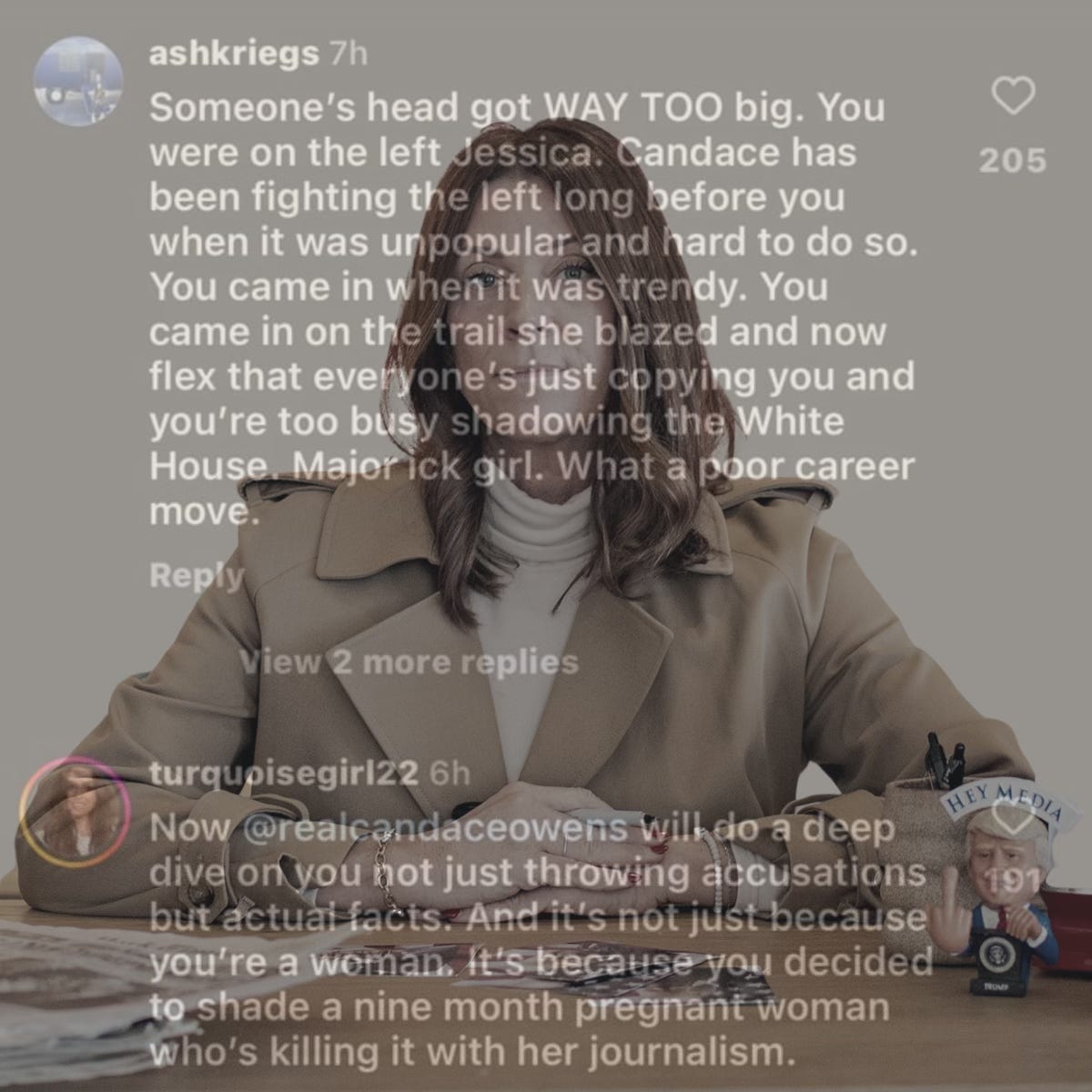 Last week, Jessica teased a takedown of Candace Owens in her Substack chat — vague threats, dramatic buildup, all smoke, no fire. Owens responded (without naming names) with a string of Instagram Stories calling out “parasitic liars” and “dark energy.” The implication was clear.